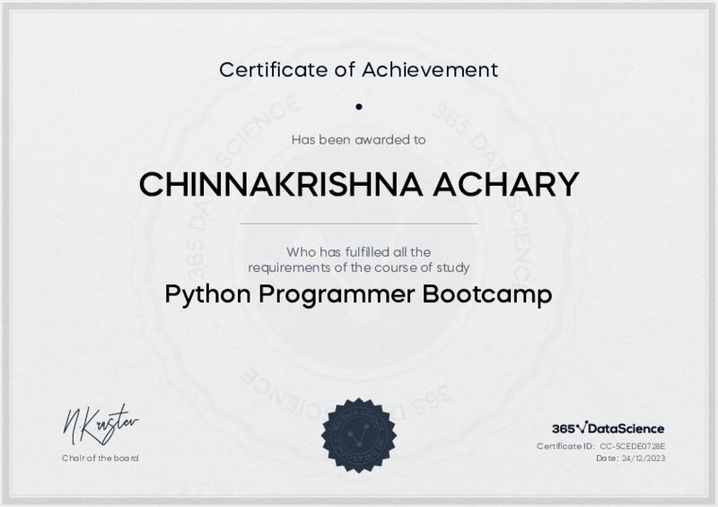 This user has been awarded the Python Programmer Bootcamp Certificate for successfully completing the course exam. Holding this certificate demonstrates their proficiency on the topic and signifies they are qualified to apply their newly acquired expertise in the fields of data analytics and data science.