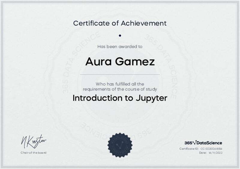 This user has been awarded the Introduction to Jupyter Certificate for successfully completing the course exam. Holding this certificate demonstrates their proficiency on the topic and signifies they are qualified to apply their newly acquired expertise in the fields of data analytics and data science.