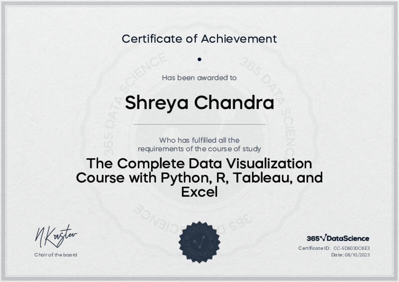This user has been awarded the The Complete Data Visualization Course with Python, R, Tableau, and Excel Certificate for successfully completing the course exam. Holding this certificate demonstrates their proficiency on the topic and signifies they are qualified to apply their newly acquired expertise in the fields of data analytics and data science.