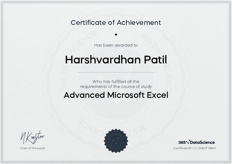This user has been awarded the Advanced Microsoft Excel Certificate for successfully completing the course exam. Holding this certificate demonstrates their proficiency on the topic and signifies they are qualified to apply their newly acquired expertise in the fields of data analytics and data science.