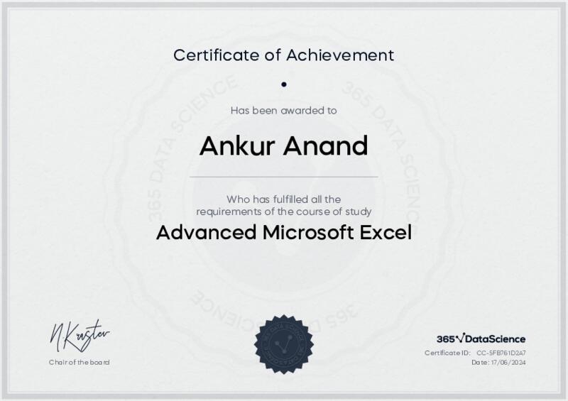 This user has been awarded the Advanced Microsoft Excel Certificate for successfully completing the course exam. Holding this certificate demonstrates their proficiency on the topic and signifies they are qualified to apply their newly acquired expertise in the fields of data analytics and data science.