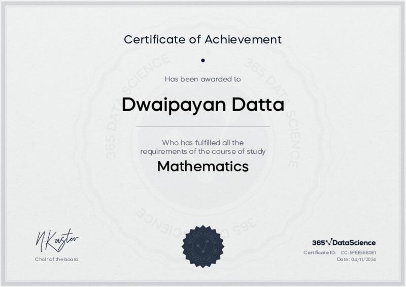 This user has been awarded the Mathematics Certificate for successfully completing the course exam. Holding this certificate demonstrates their proficiency on the topic and signifies they are qualified to apply their newly acquired expertise in the fields of data analytics and data science.