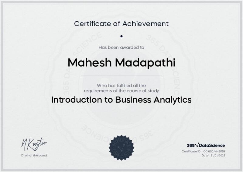 This user has been awarded the Introduction to Business Analytics Certificate for successfully completing the course exam. Holding this certificate demonstrates their proficiency on the topic and signifies they are qualified to apply their newly acquired expertise in the fields of data analytics and data science.