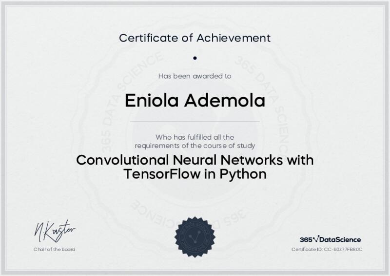 This user has been awarded the Convolutional Neural Networks with TensorFlow in Python Certificate for successfully completing the course exam. Holding this certificate demonstrates their proficiency on the topic and signifies they are qualified to apply their newly acquired expertise in the fields of data analytics and data science.