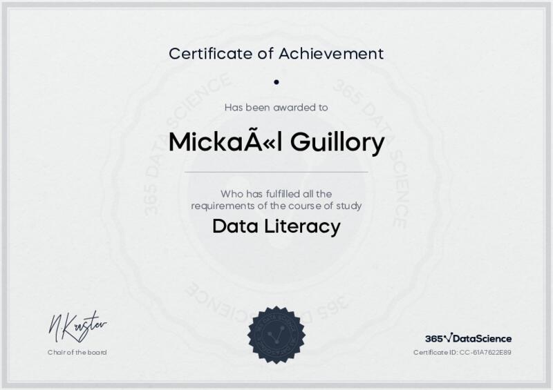 This user has been awarded the Data Literacy Certificate for successfully completing the course exam. Holding this certificate demonstrates their proficiency on the topic and signifies they are qualified to apply their newly acquired expertise in the fields of data analytics and data science.