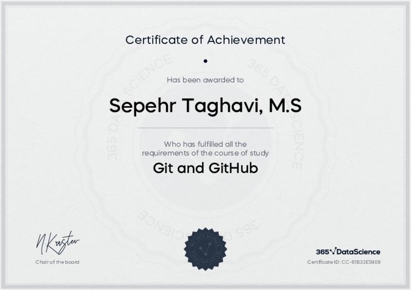 This user has been awarded the Git and GitHub Certificate for successfully completing the course exam. Holding this certificate demonstrates their proficiency on the topic and signifies they are qualified to apply their newly acquired expertise in the fields of data analytics and data science.