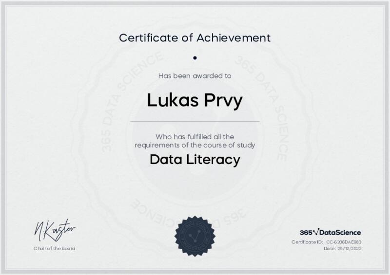This user has been awarded the Data Literacy Certificate for successfully completing the course exam. Holding this certificate demonstrates their proficiency on the topic and signifies they are qualified to apply their newly acquired expertise in the fields of data analytics and data science.