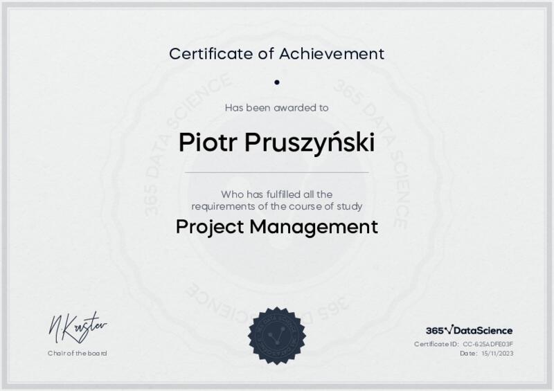 This user has been awarded the Project Management Certificate for successfully completing the course exam. Holding this certificate demonstrates their proficiency on the topic and signifies they are qualified to apply their newly acquired expertise in the fields of data analytics and data science.