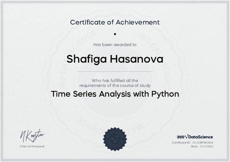 This user has been awarded the Time Series Analysis with Python Certificate for successfully completing the course exam. Holding this certificate demonstrates their proficiency on the topic and signifies they are qualified to apply their newly acquired expertise in the fields of data analytics and data science.
