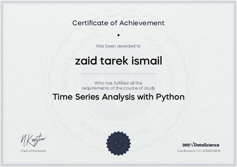 This user has been awarded the Time Series Analysis with Python Certificate for successfully completing the course exam. Holding this certificate demonstrates their proficiency on the topic and signifies they are qualified to apply their newly acquired expertise in the fields of data analytics and data science.