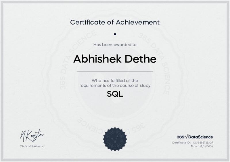 This user has been awarded the SQL Certificate for successfully completing the course exam. Holding this certificate demonstrates their proficiency on the topic and signifies they are qualified to apply their newly acquired expertise in the fields of data analytics and data science.