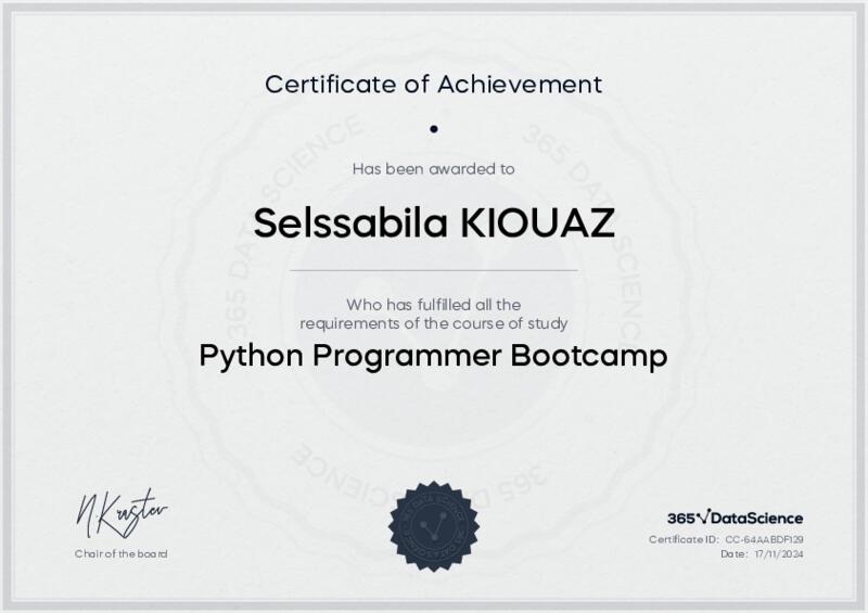 This user has been awarded the Python Programmer Bootcamp Certificate for successfully completing the course exam. Holding this certificate demonstrates their proficiency on the topic and signifies they are qualified to apply their newly acquired expertise in the fields of data analytics and data science.