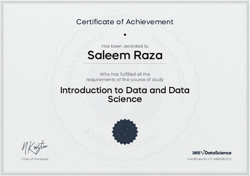This user has been awarded the Introduction to Data and Data Science Certificate for successfully completing the course exam. Holding this certificate demonstrates their proficiency on the topic and signifies they are qualified to apply their newly acquired expertise in the fields of data analytics and data science.