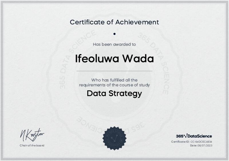 This user has been awarded the Data Strategy Certificate for successfully completing the course exam. Holding this certificate demonstrates their proficiency on the topic and signifies they are qualified to apply their newly acquired expertise in the fields of data analytics and data science.