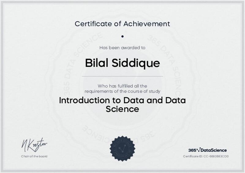 This user has been awarded the Introduction to Data and Data Science Certificate for successfully completing the course exam. Holding this certificate demonstrates their proficiency on the topic and signifies they are qualified to apply their newly acquired expertise in the fields of data analytics and data science.