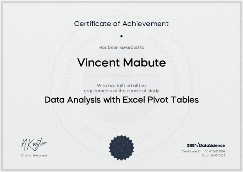 This user has been awarded the Data Analysis with Excel Pivot Tables Certificate for successfully completing the course exam. Holding this certificate demonstrates their proficiency on the topic and signifies they are qualified to apply their newly acquired expertise in the fields of data analytics and data science.