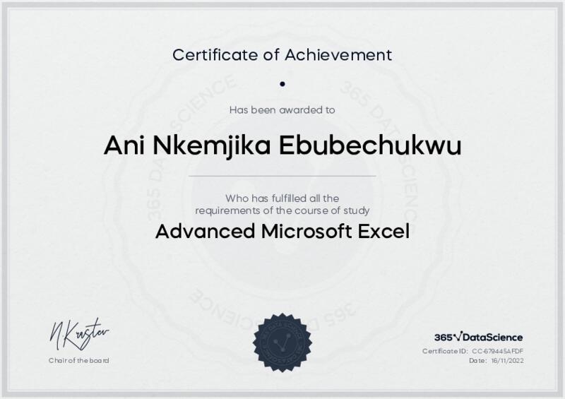 This user has been awarded the Advanced Microsoft Excel Certificate for successfully completing the course exam. Holding this certificate demonstrates their proficiency on the topic and signifies they are qualified to apply their newly acquired expertise in the fields of data analytics and data science.