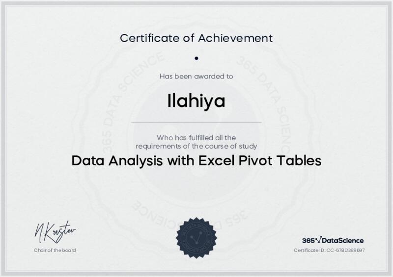 This user has been awarded the Data Analysis with Excel Pivot Tables Certificate for successfully completing the course exam. Holding this certificate demonstrates their proficiency on the topic and signifies they are qualified to apply their newly acquired expertise in the fields of data analytics and data science.