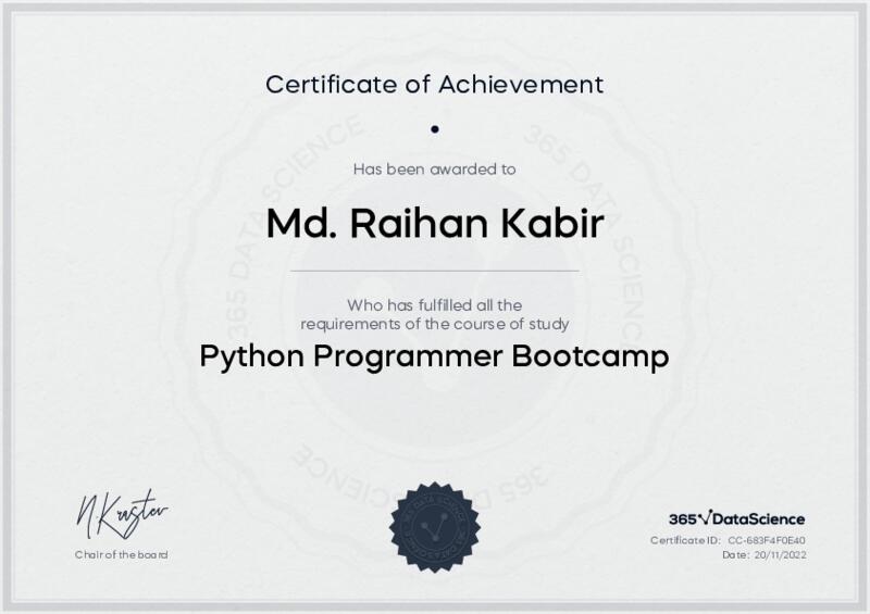 This user has been awarded the Python Programmer Bootcamp Certificate for successfully completing the course exam. Holding this certificate demonstrates their proficiency on the topic and signifies they are qualified to apply their newly acquired expertise in the fields of data analytics and data science.