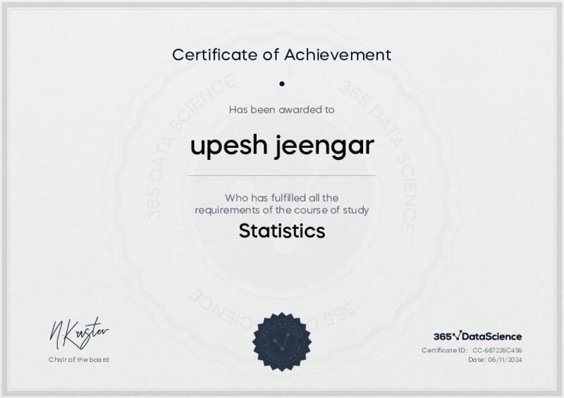 This user has been awarded the Statistics Certificate for successfully completing the course exam. Holding this certificate demonstrates their proficiency on the topic and signifies they are qualified to apply their newly acquired expertise in the fields of data analytics and data science.