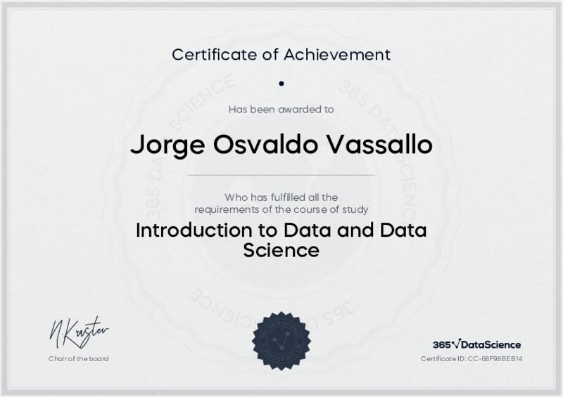 This user has been awarded the Introduction to Data and Data Science Certificate for successfully completing the course exam. Holding this certificate demonstrates their proficiency on the topic and signifies they are qualified to apply their newly acquired expertise in the fields of data analytics and data science.