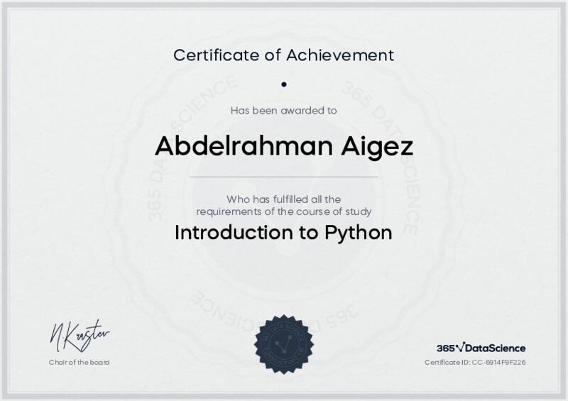 This user has been awarded the Introduction to Python Certificate for successfully completing the course exam. Holding this certificate demonstrates their proficiency on the topic and signifies they are qualified to apply their newly acquired expertise in the fields of data analytics and data science.