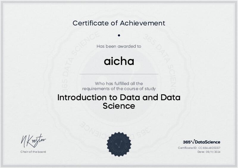 This user has been awarded the Introduction to Data and Data Science Certificate for successfully completing the course exam. Holding this certificate demonstrates their proficiency on the topic and signifies they are qualified to apply their newly acquired expertise in the fields of data analytics and data science.