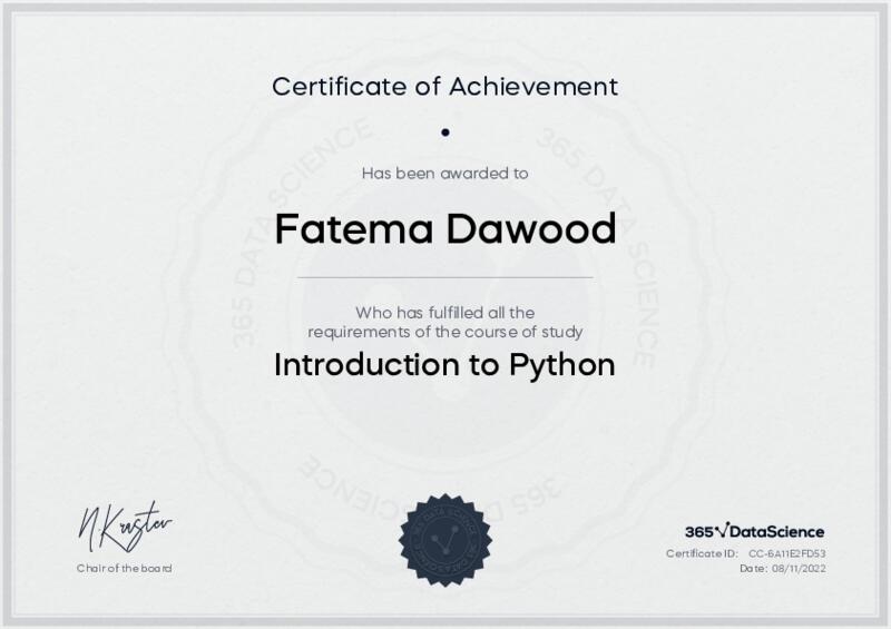 This user has been awarded the Introduction to Python Certificate for successfully completing the course exam. Holding this certificate demonstrates their proficiency on the topic and signifies they are qualified to apply their newly acquired expertise in the fields of data analytics and data science.