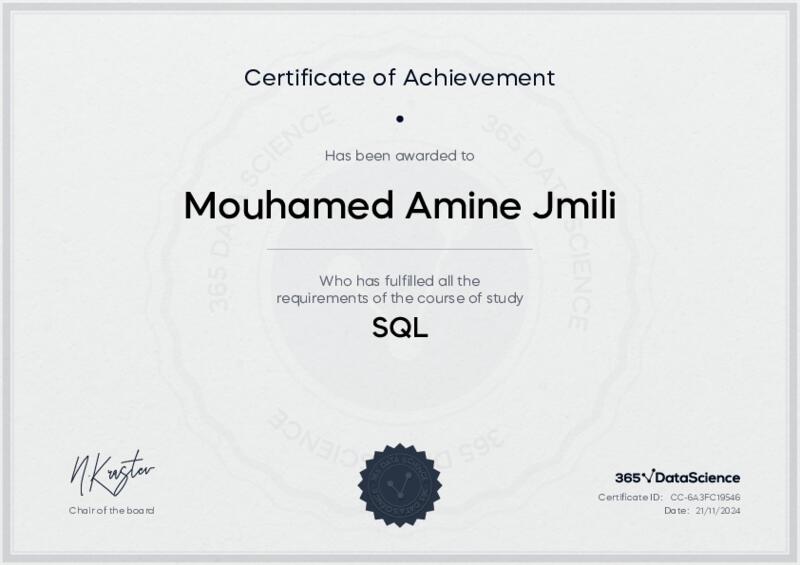 This user has been awarded the SQL Certificate for successfully completing the course exam. Holding this certificate demonstrates their proficiency on the topic and signifies they are qualified to apply their newly acquired expertise in the fields of data analytics and data science.