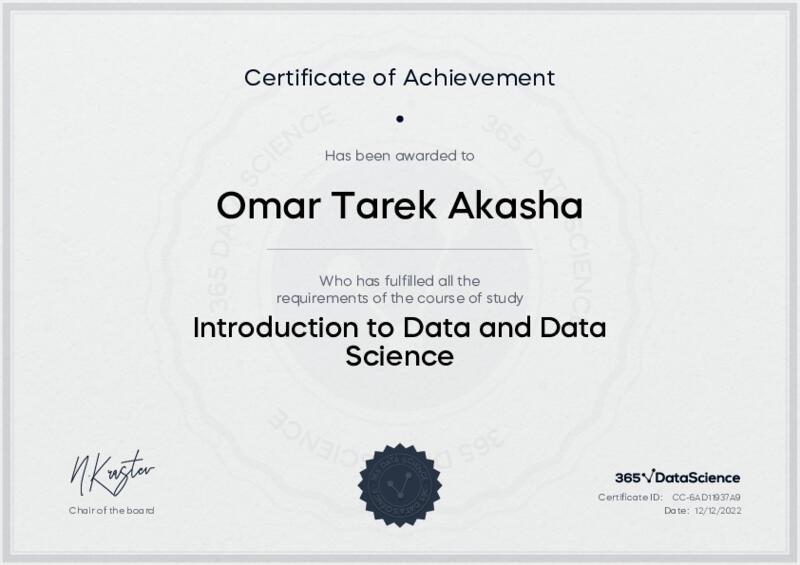 This user has been awarded the Introduction to Data and Data Science Certificate for successfully completing the course exam. Holding this certificate demonstrates their proficiency on the topic and signifies they are qualified to apply their newly acquired expertise in the fields of data analytics and data science.