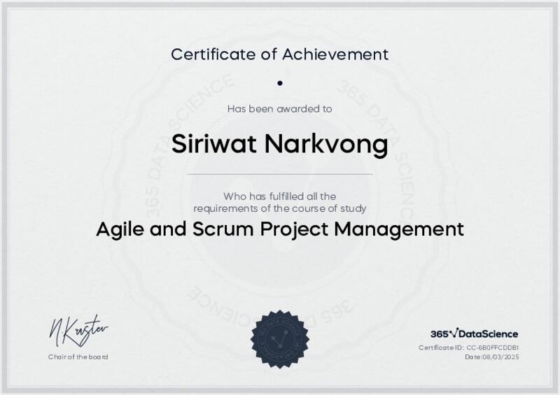 This user has been awarded the Agile and Scrum Project Management Certificate for successfully completing the course exam. Holding this certificate demonstrates their proficiency on the topic and signifies they are qualified to apply their newly acquired expertise in the fields of data analytics and data science.
