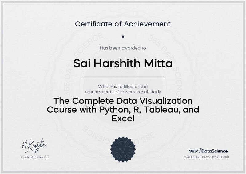 This user has been awarded the The Complete Data Visualization Course with Python, R, Tableau, and Excel Certificate for successfully completing the course exam. Holding this certificate demonstrates their proficiency on the topic and signifies they are qualified to apply their newly acquired expertise in the fields of data analytics and data science.