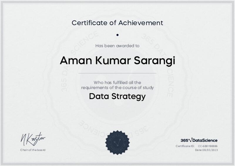 This user has been awarded the Data Strategy Certificate for successfully completing the course exam. Holding this certificate demonstrates their proficiency on the topic and signifies they are qualified to apply their newly acquired expertise in the fields of data analytics and data science.