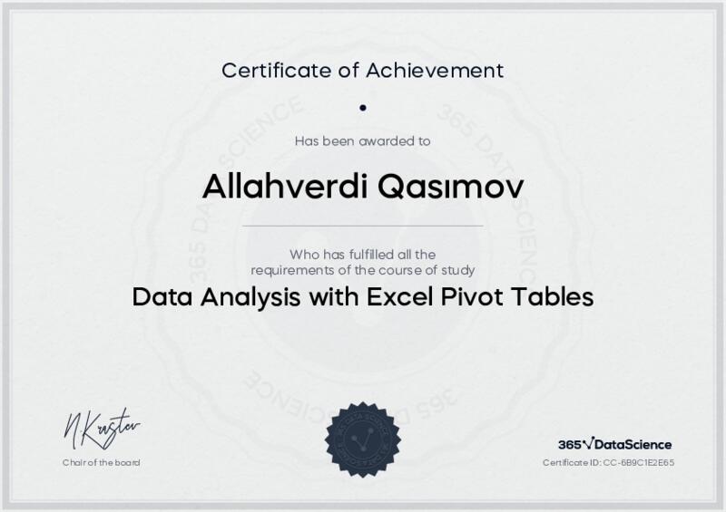 This user has been awarded the Data Analysis with Excel Pivot Tables Certificate for successfully completing the course exam. Holding this certificate demonstrates their proficiency on the topic and signifies they are qualified to apply their newly acquired expertise in the fields of data analytics and data science.