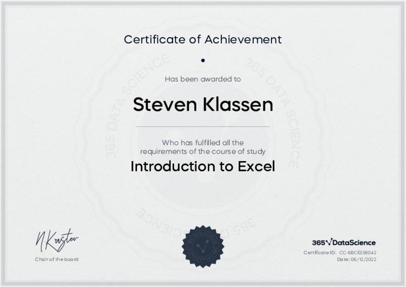 This user has been awarded the Introduction to Excel Certificate for successfully completing the course exam. Holding this certificate demonstrates their proficiency on the topic and signifies they are qualified to apply their newly acquired expertise in the fields of data analytics and data science.