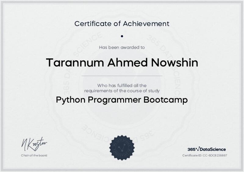This user has been awarded the Python Programmer Bootcamp Certificate for successfully completing the course exam. Holding this certificate demonstrates their proficiency on the topic and signifies they are qualified to apply their newly acquired expertise in the fields of data analytics and data science.