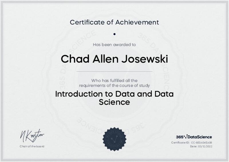 This user has been awarded the Introduction to Data and Data Science Certificate for successfully completing the course exam. Holding this certificate demonstrates their proficiency on the topic and signifies they are qualified to apply their newly acquired expertise in the fields of data analytics and data science.