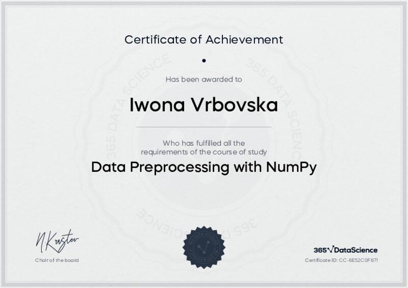 This user has been awarded the Data Preprocessing with NumPy Certificate for successfully completing the course exam. Holding this certificate demonstrates their proficiency on the topic and signifies they are qualified to apply their newly acquired expertise in the fields of data analytics and data science.