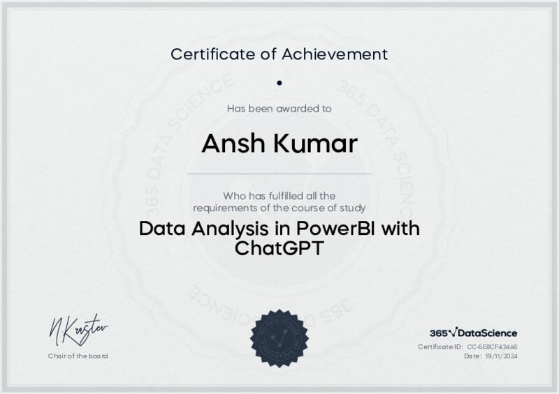 This user has been awarded the Data Analysis in PowerBI with ChatGPT Certificate for successfully completing the course exam. Holding this certificate demonstrates their proficiency on the topic and signifies they are qualified to apply their newly acquired expertise in the fields of data analytics and data science.
