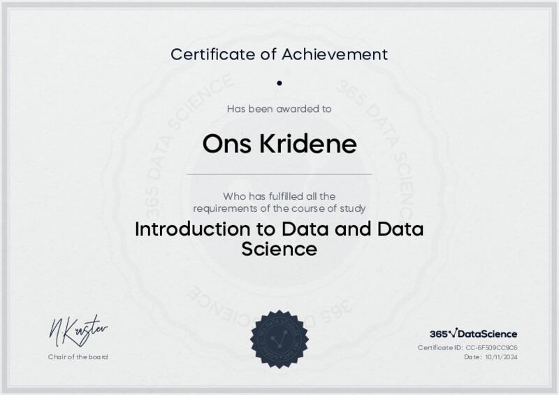 This user has been awarded the Introduction to Data and Data Science Certificate for successfully completing the course exam. Holding this certificate demonstrates their proficiency on the topic and signifies they are qualified to apply their newly acquired expertise in the fields of data analytics and data science.