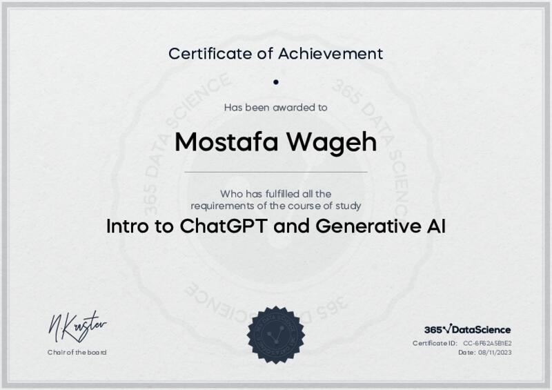This user has been awarded the Intro to ChatGPT and Generative AI Certificate for successfully completing the course exam. Holding this certificate demonstrates their proficiency on the topic and signifies they are qualified to apply their newly acquired expertise in the fields of data analytics and data science.