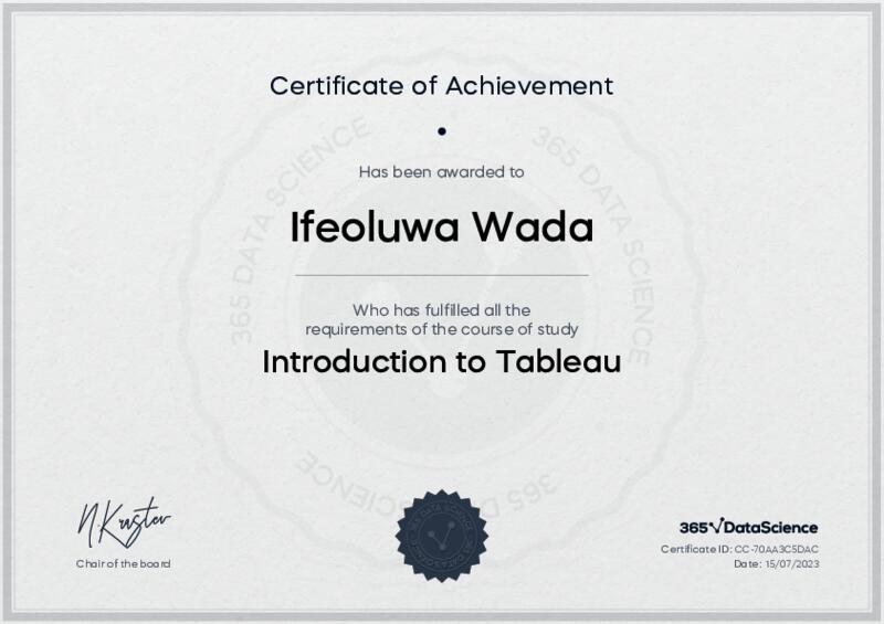 This user has been awarded the Introduction to Tableau Certificate for successfully completing the course exam. Holding this certificate demonstrates their proficiency on the topic and signifies they are qualified to apply their newly acquired expertise in the fields of data analytics and data science.