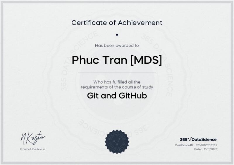 This user has been awarded the Git and GitHub Certificate for successfully completing the course exam. Holding this certificate demonstrates their proficiency on the topic and signifies they are qualified to apply their newly acquired expertise in the fields of data analytics and data science.