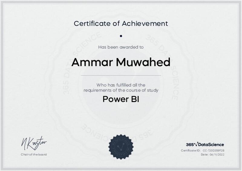 This user has been awarded the Power BI Certificate for successfully completing the course exam. Holding this certificate demonstrates their proficiency on the topic and signifies they are qualified to apply their newly acquired expertise in the fields of data analytics and data science.