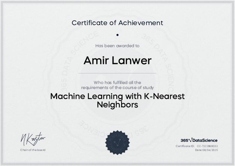 This user has been awarded the Machine Learning with K-Nearest Neighbors Certificate for successfully completing the course exam. Holding this certificate demonstrates their proficiency on the topic and signifies they are qualified to apply their newly acquired expertise in the fields of data analytics and data science.