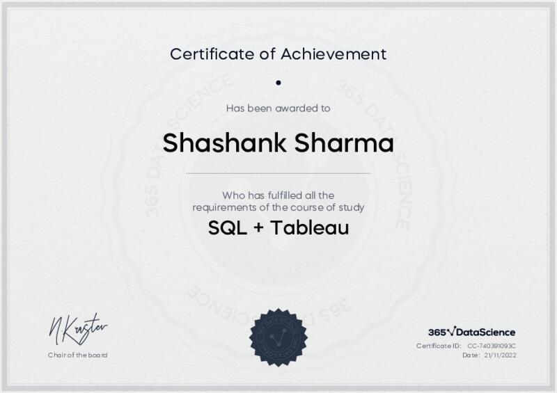 This user has been awarded the SQL + Tableau Certificate for successfully completing the course exam. Holding this certificate demonstrates their proficiency on the topic and signifies they are qualified to apply their newly acquired expertise in the fields of data analytics and data science.