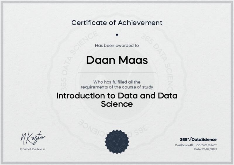 This user has been awarded the Introduction to Data and Data Science Certificate for successfully completing the course exam. Holding this certificate demonstrates their proficiency on the topic and signifies they are qualified to apply their newly acquired expertise in the fields of data analytics and data science.