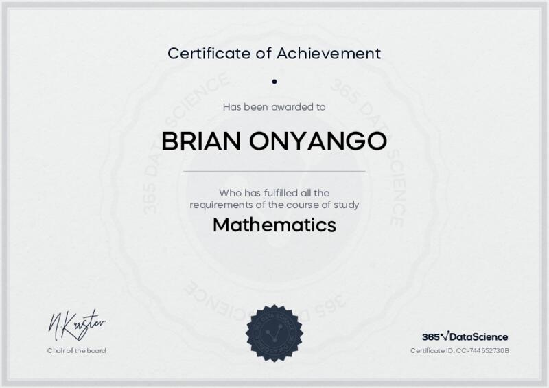This user has been awarded the Mathematics Certificate for successfully completing the course exam. Holding this certificate demonstrates their proficiency on the topic and signifies they are qualified to apply their newly acquired expertise in the fields of data analytics and data science.