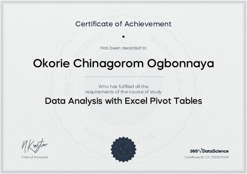 This user has been awarded the Data Analysis with Excel Pivot Tables Certificate for successfully completing the course exam. Holding this certificate demonstrates their proficiency on the topic and signifies they are qualified to apply their newly acquired expertise in the fields of data analytics and data science.