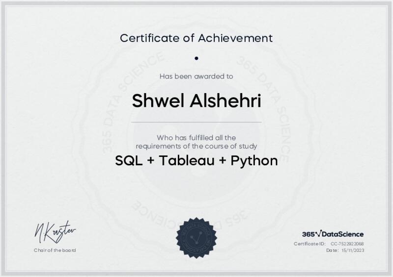 This user has been awarded the SQL + Tableau + Python Certificate for successfully completing the course exam. Holding this certificate demonstrates their proficiency on the topic and signifies they are qualified to apply their newly acquired expertise in the fields of data analytics and data science.
